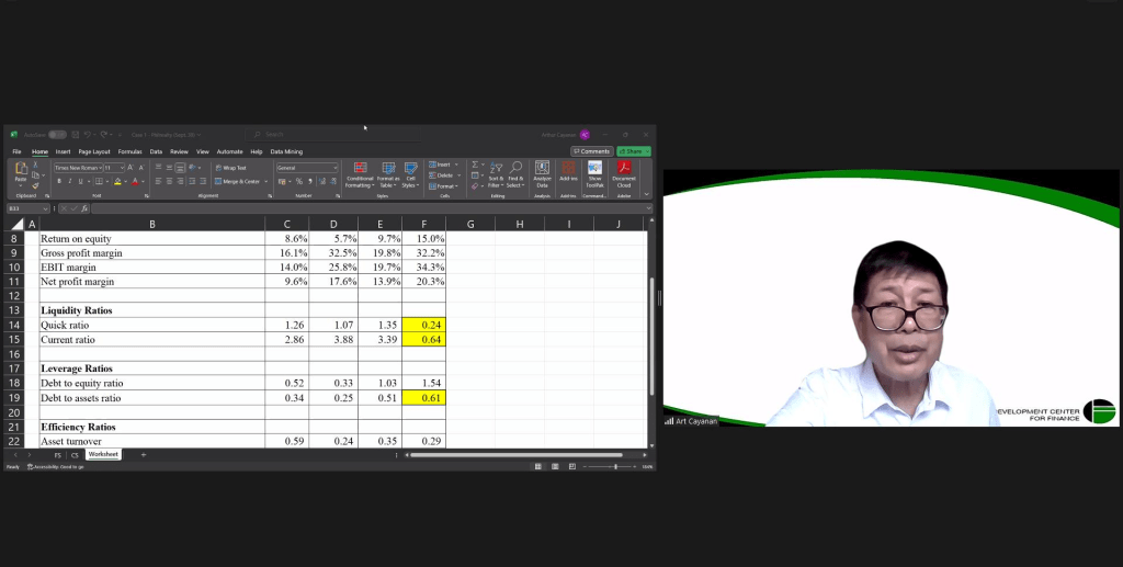 During the last day of the seminar, Dr. Arthur Cayanan started the session with a review of the discussions in the past three (3) Saturdays, then introduced other FS analysis techniques, including common-size, trend, and break-even analysis. Cases of Philippine-listed companies were then presented and discussed to apply all the learnings during the seminar, taking different perspectives, as lenders, financial analysts, and even as investors.
