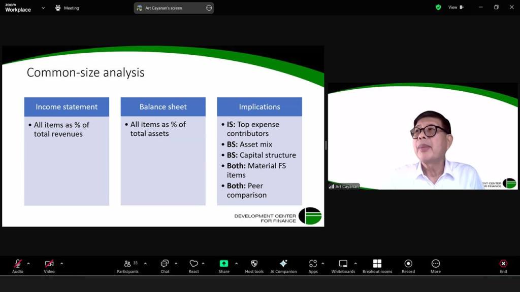 Sir Art Cayanan took over on the last day of the seminar, starting the session with a review of the discussions in the past three (3) Saturdays, then introducing other FS analysis techniques, including common-size, trend, and break-even analyses. Cases of several Philippine-listed companies were then presented and discussed to apply all the learnings during the seminar, taking different perspectives, as lenders, financial analysts, and even as investors.